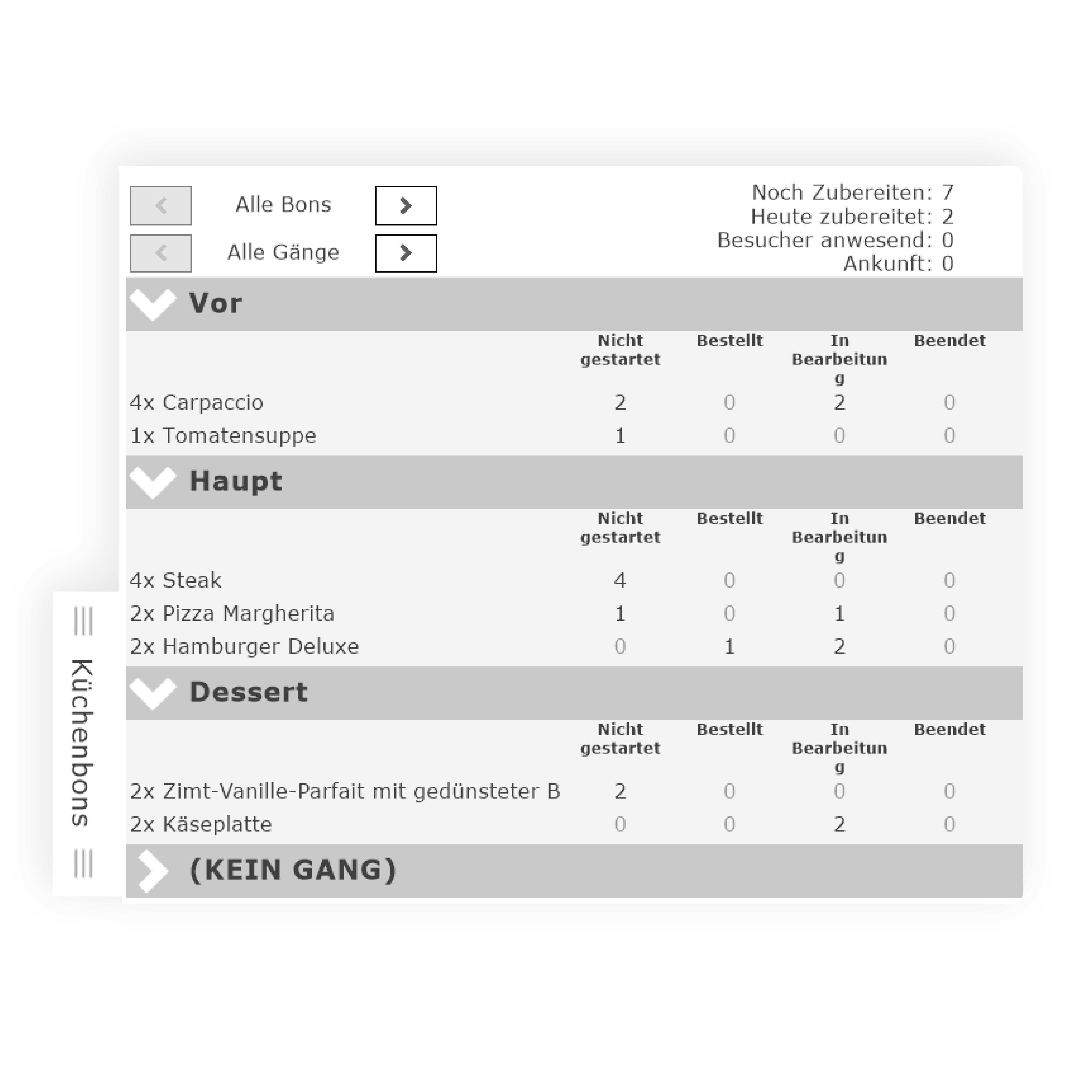 Door communicatie van het hoogste niveau. Werk overzichtelijk met gangen en bekijk de status van de bonnen in een oogopslag. Een gang uitvragen of juist klaar met bereiden? Meld het op het keukenscherm en het hele team is direct op de hoogte.