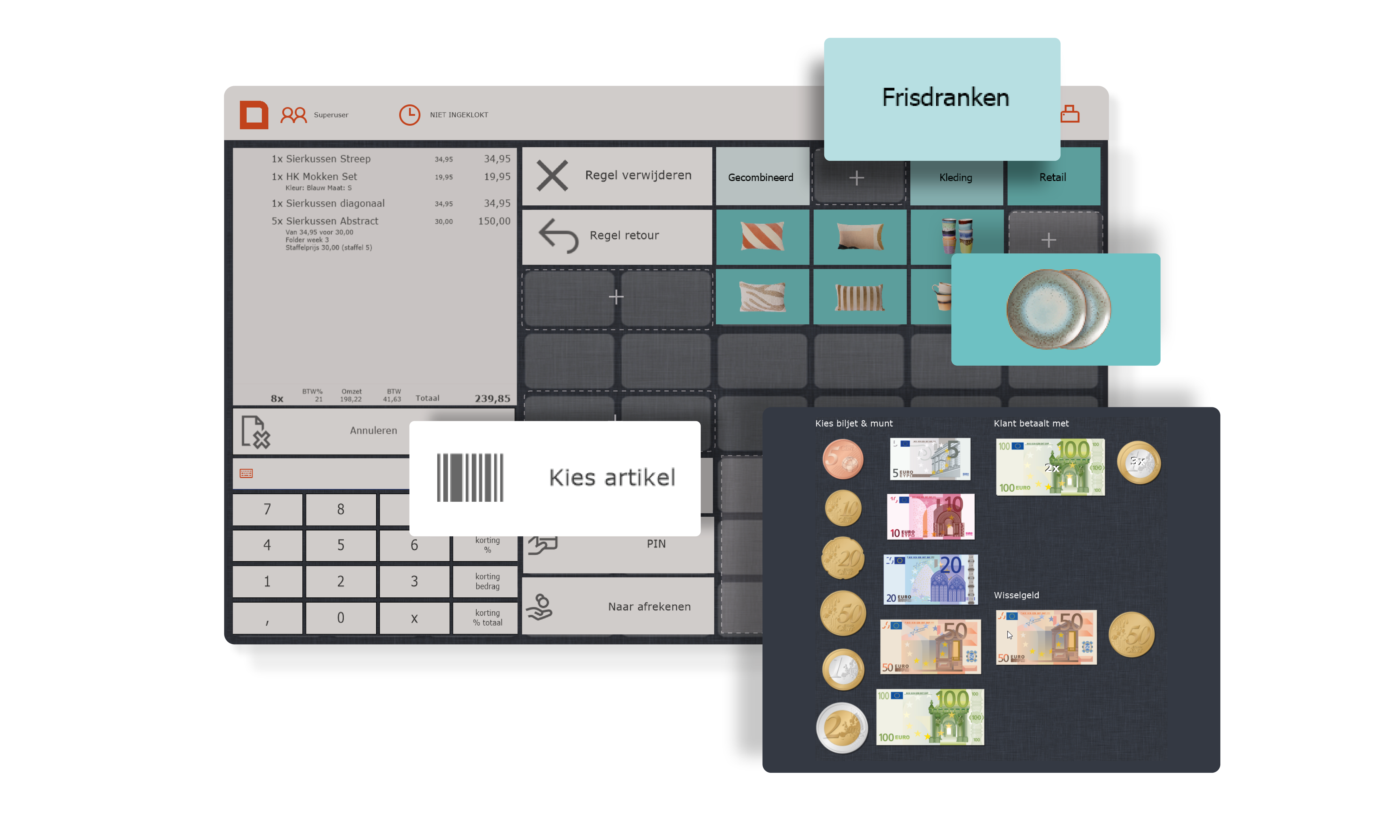Dankzij de visuele weergave van biljetten en munten wordt wisselgeld automatisch en foutloos berekend. De kassa software bepaalt de meest efficiënte teruggave. Betalen via PIN is nog eenvoudiger: met één druk op de knop stuur je het exacte bedrag naar het pinapparaat, wat zorgt voor een soepele en snelle transactie.