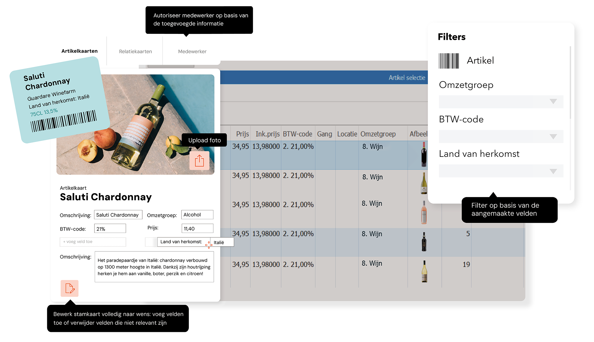 De flexibiliteit van MplusKASSA zie je overal in terug. De stamkaarten die je zelf kunt aanpassen, maken het kassasysteem uniek. Voeg velden toe en laat het overbodige achterwege. Zo creëer je een op maat gemaakte stamkaart voor een onbeperkt aantal artikelen, medewerkers en relaties. De velden vind je overal terug in jouw kassa.